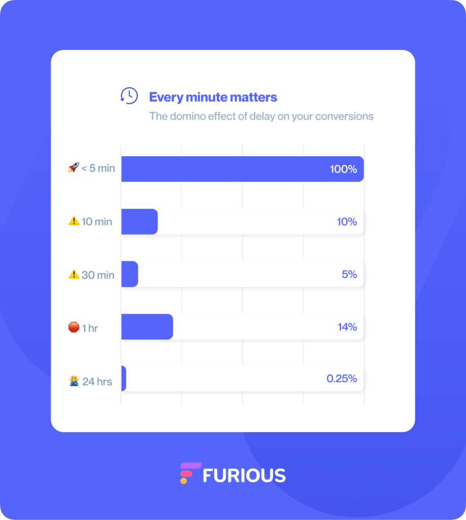 Chaque minute de retard a un coût exponentiel. Attendre 10 minutes au lieu de 5 ? Vous perdez déjà 90 % de votre efficacité. Répondre après 30 minutes vous rend 21 fois moins efficace. Et si vous laissez passer 24 heures, vos chances de conversion chutent de 400 fois par rapport à une réponse dans les 5 minutes.